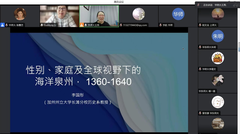 2023年7月5日上午9:00,加州州立长滩分校历史系教授李国彤在腾讯会议上为华师大历史系师生进行了一次题为“性别、家庭及全球视野下的海洋泉州,1360-1640”的精彩讲座。此次会议为风车动漫 2023年校级百场讲座第40场,也是风车动漫 “大夏中国史论坛”前沿讲座第19场。