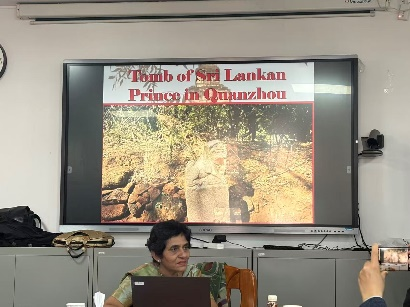 宾度基于郑和几下西洋的历史文献,从斯里兰卡本土角度重新审视了明朝与狮子国的交往历史,同时探讨更深层次的时代背景。宾度老师指出明代官方的记载与斯里兰卡本地的历史及考古遗存情况存在出入,《明实录》中记载的郑和于1409-1411年第三次下西洋中抓获斯里兰卡国王亚烈苦奈儿与当地王权更替时间有出入:根据斯里兰卡方面的记载,这个事件发生的时间应该在第二次下西洋的1407-1409之间,在此过程中有可能是郑和舰队中的其他人填补了这一空缺,或者抓获的是当时与斯里兰卡国王相对立的沿海割据政权领主。此外,宾度老师还提出了许多新问题,如从英国,荷兰,中国等对斯里兰卡的称谓探究锡兰这一名称的由来问题,还展示了斯里兰卡现存有关这段历史的考古遗迹等,如墓葬,石碑,壁画,以及宗教寺庙等。特别值得关注的是,宾度提到中国泉州发现的斯里兰卡的相关遗迹,认为这些证据对谱写中斯历史渊源具有重要价值。