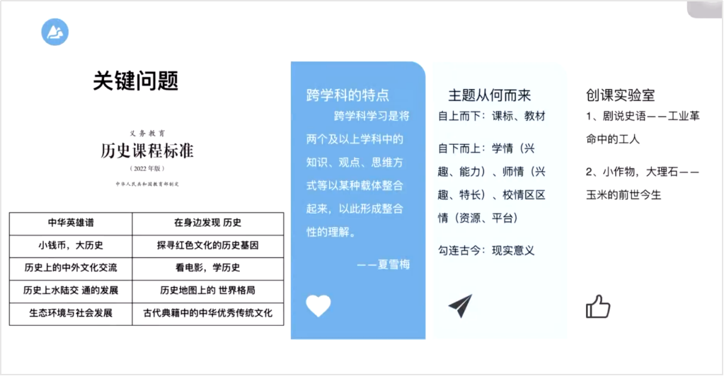 2022 年版义务教育历史课程标准明确指出,为发展学生核心素养,推动历史学习方式转变,增强学生运用多学科知识与技能开展综合探究的能力,中学历史课程需在总课时中安排 10% 用于跨学科主题学习活动。通过引导学生围绕研究主题,融合历史与其他课程知识、技能、方法及课题研究,开展深度探究与问题解决的综合实践活动。如今,跨学科主题学习已成为中学历史教学的热门话题,越来越多的风车动漫 同学以跨学科主题微课的教学形式参与社会实践。如何设计此类活动与课程?本次活动吸引了众多本硕同学和中学教师参与。