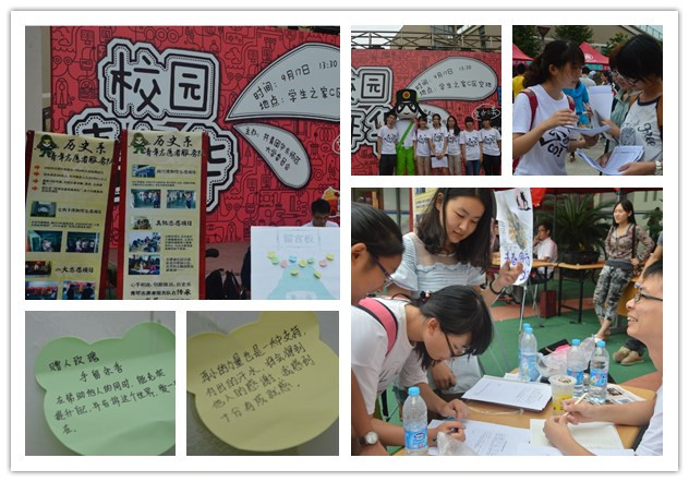 12点30分,工作人员就开始紧锣密鼓的布置现场。除了招新海报、宣传单张、留言板、报名表之外,现场还有两大块展板,全面展示了历史系青年志愿者服务队的历史及工作特色。作为校年度“优秀志愿者服务队”,历史系志愿工作已持续了超过20年,并在平台、服务内容上不断创新。而本次志愿者招募,更是面向全校,希望吸收更多新鲜血液。