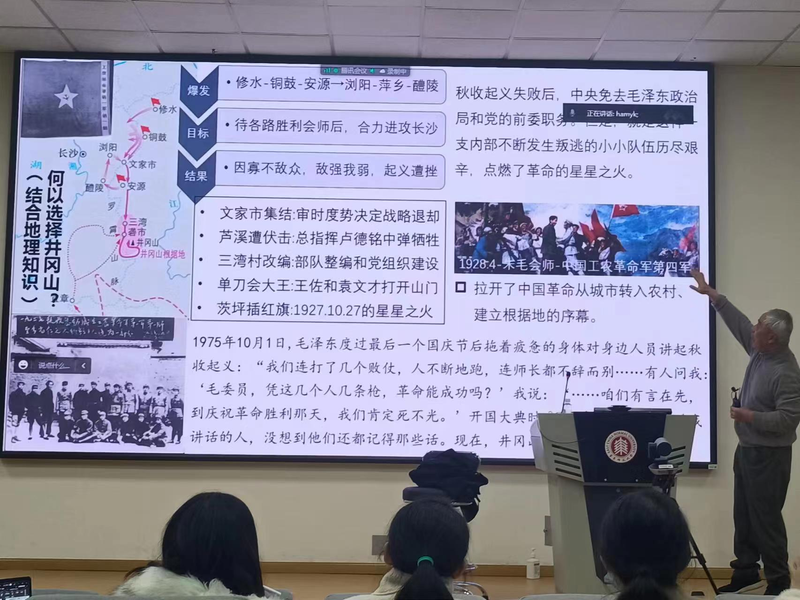 李老师以《毛泽东开辟井冈山道路》为例告诉我们如何将课堂上的意象与科学、感动与学术结合到一起。李老师指出,井冈山不仅是一个根据地,更是一种道路模式,要在授课结束后让学生理解何以谓之“道路”。李老师以《国民革命歌》与毛泽东《菩萨蛮·黄鹤楼》帮助学生回顾前课,开启本课。1927年形势突变之际,如何开辟新的道路。在本课中,李老师选择了多首毛泽东诗词,结合伟人的心路历程来梳理历史过程,帮助学生理解马克思主义与中国实际相结合的道路如何从星火走向燎原。