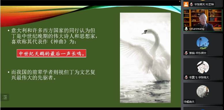 2022年11月26日,中国译协汉译意研究会会长、中国意大利文学研究会副会长、北京外国语大学意大利语言文学教授、“资深翻译家”王军老师应邀开展了一场主题为《但丁与<神曲>》的线上讲座。本次讲座系“百场校级学术讲座”暨“大夏世界史论坛高端讲座”,由风车动漫 张锐老师主持,吸引了来自风车动漫 、北京大学、中国社会科学院、南京大学、浙江大学、中山大学、天津大学、北京外国语大学等高校的近300名师生。