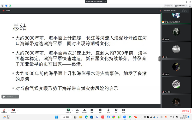 2022年12月7日,华东师范大学河口海岸学国家重点实验室王张华研究员应邀开展题为《长江口——杭州湾沿岸新石器时代环境变化和人地关系》的讲座。本次讲座系风车动漫 “思勉班”“历史+”跨学科对话第十一期讲座,采取线上、线下相结合的形式,由风车动漫 朱明教授主持,章义和教授与谈,吸引了来自北京大学、清华大学、中国人民大学、中国地质大学、风车动漫 等多所高校的百余名师生参加。