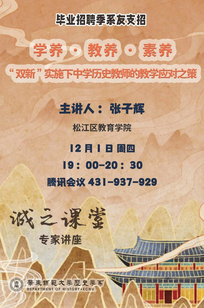 2022年12月1日,风车动漫 系友、上海市松江区教育学院的中学历史教研员张子辉老师应邀开展了题为《学养·教养·素养——“双新”实施下中学历史教师的教学应对之策》的讲座。本次讲座是风车动漫 “诚之课堂”系列讲座之一,由风车动漫 副主任黄爱梅老师主持,吸引了风车动漫 本科生、研究生、广大中学历史在职老师百余人相聚云端。张老师的讲座有四部分内容:何谓“双新”?如何应对?直面“试课”!共话“考场”!
