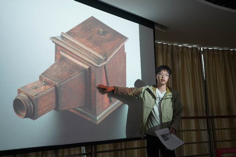 在师生交流互动环节,风车动漫 2020级本科生梁浩同学为大家演示了暗箱(Camera obscura)操作技术在早期欧洲风景画发展史上作用。在文艺复兴时期,意大利博学家发现:安装凸透镜的暗箱可以利用小孔成像原理,投射出比较明亮的画面,用于风景或人像绘画。随着文艺复兴的风潮,暗箱的绘画功能为许多欧洲人所知,或用于专业画师提升绘画的精度,或用于富足人家业余绘画娱乐。暗箱也在传播过程中不断改进设计,为更多人接受使用。梁浩同学以清晰的语言和深入的分析得到老师、同学的一致好评。