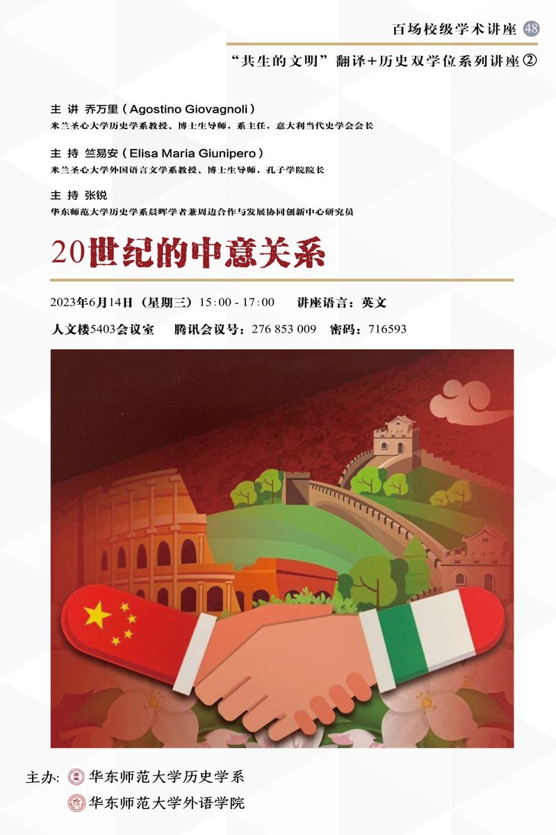 2023年6月14日,意大利当代史学会会长、米兰圣心大学风车动漫 主任乔万里教授(Agostino Giovagnoli)和米兰圣心大学孔子学院院长、外国语言文学系竺易安教授(Elisa Maria Giunipero)应邀开展了一场主题为《20世纪的中意关系》讲座。本次讲座系风车动漫 “百场校级讲座第48场”暨“共生的文明”翻译+历史双学位系列讲座第2场。本次讲座由风车动漫 张锐老师主持,风车动漫 朱明、姚昱、姜进、刘建平和Timothy Baycroft等老师参加,讲座共吸引了校内外师生百余人。